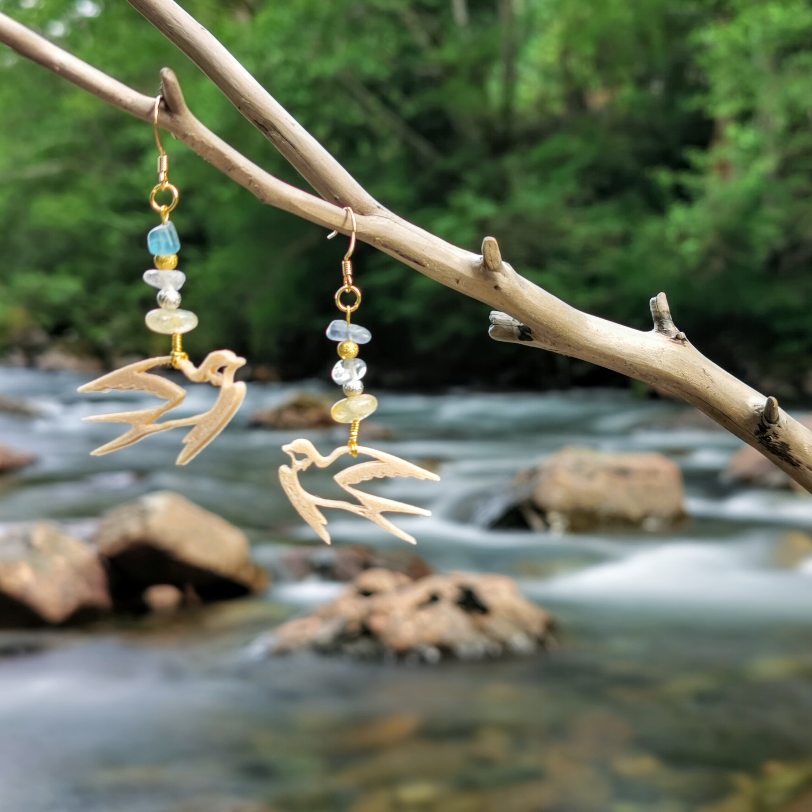 Every evening, the swallows perform their aerial dance over the river, catching insects rising from the water, illuminated brightly by the setting sun. I tried to capture their elegance with natural wood pieces under a pale sky of blue fluorite and yellow citrine quartz.