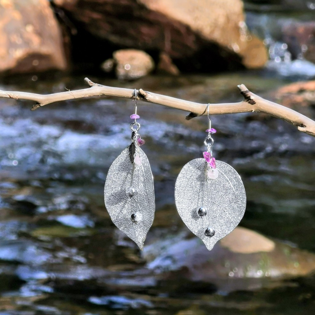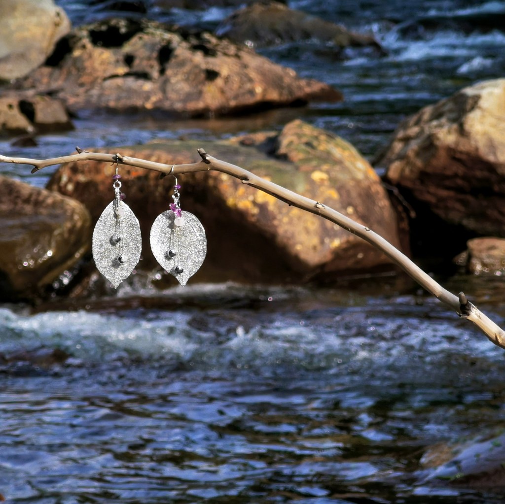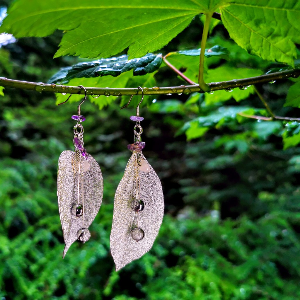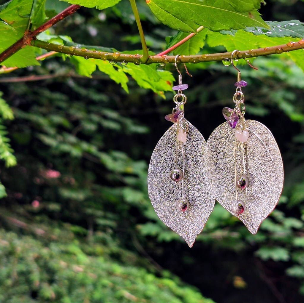 It is a wet, misty spring evening, and every tree branch is dripping tiny silver sparkling balls of water. The shining drops trickle down the leaves and fall freely to the earth below. I captured the feeling of weightless peace with natural tree leaves plated with silver and a pair of silver chains, with tiny drops of rose quartz, amethyst, and silver snow beads.
