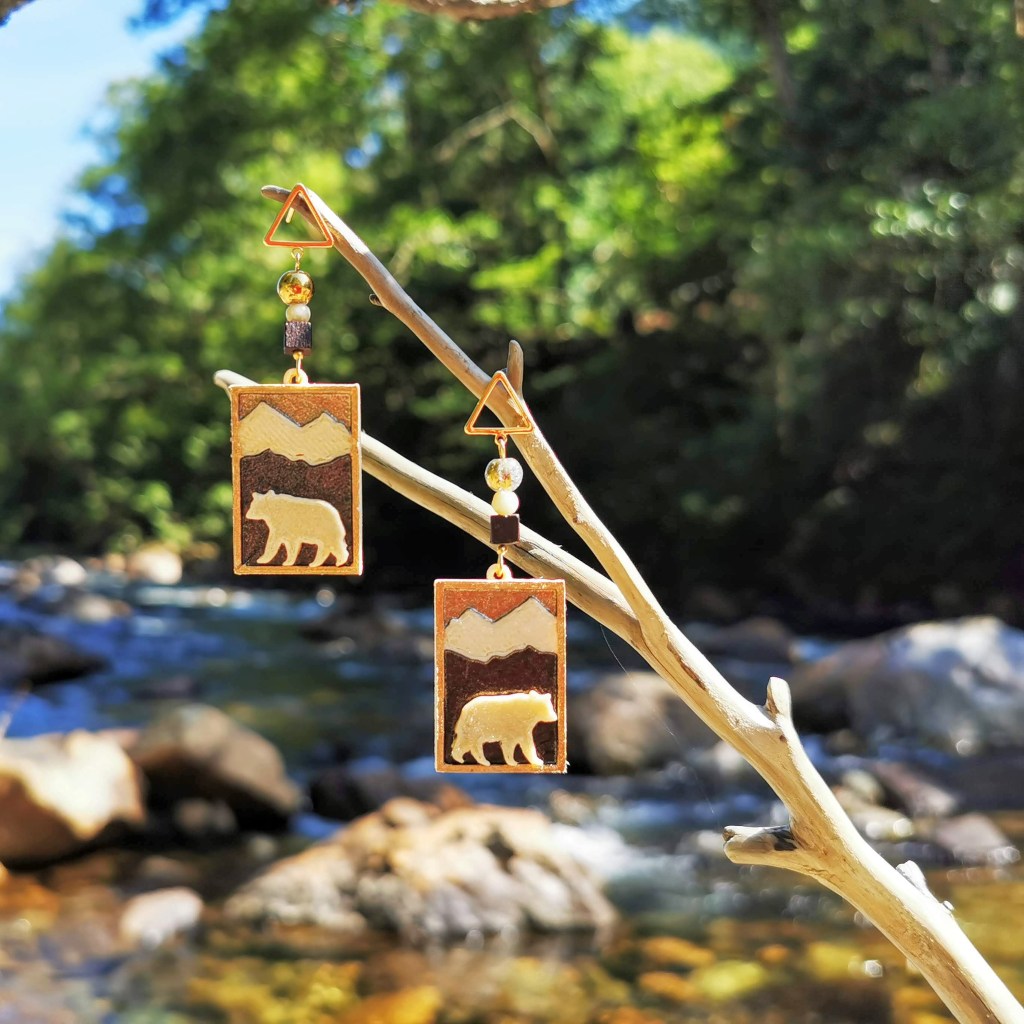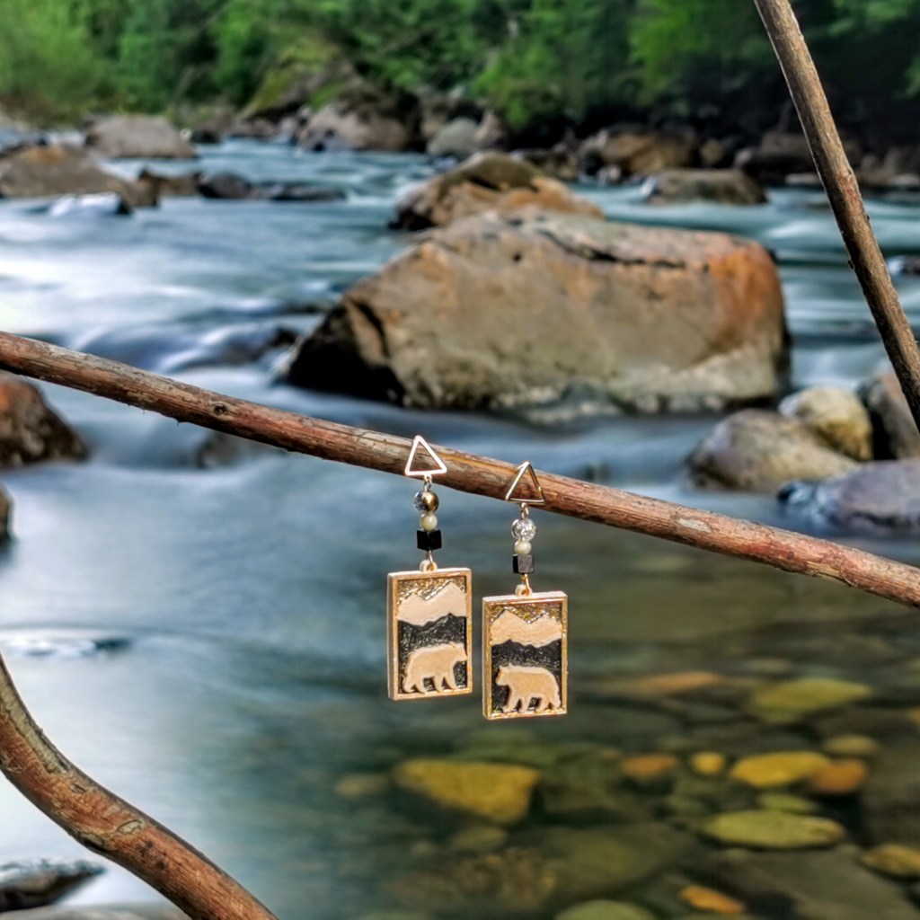 Twin Falls State Park: After many days of sunshine, the river has dropped to its summer low – shallow, but still icy cold. The gold triangle studs fit tightly into a piece of driftwood lying on the river bank. Just above, it seems that the bears are about to step out of their frames and cross the river.